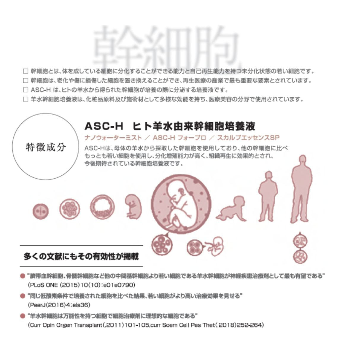再生医療技術から生まれたヒト羊水由来幹細胞培養液(ASC-H)と、天然微細針スピキュールを配合した 次世代スカルプケアアイテムです。