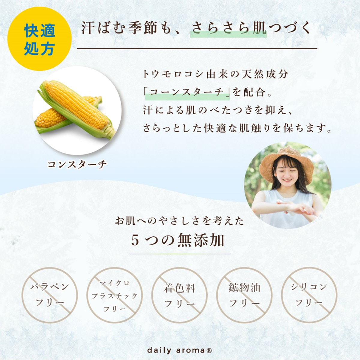 パウダーイン処方のジェルで気になる汗を抑えてサラサラとひんやりとした清涼感と爽やかな香りがしっかり持続。