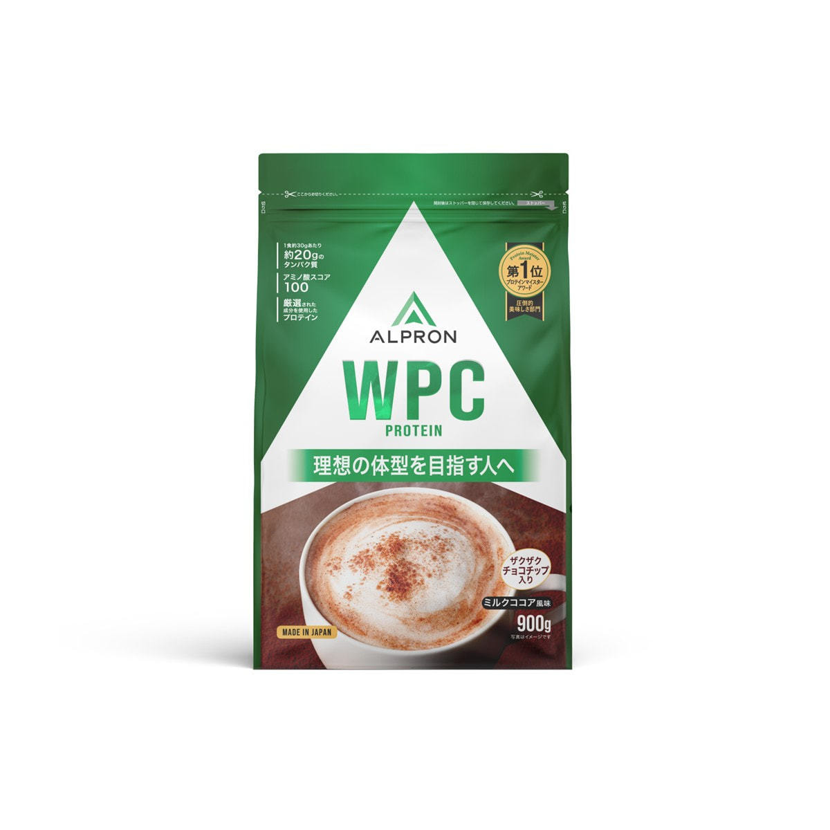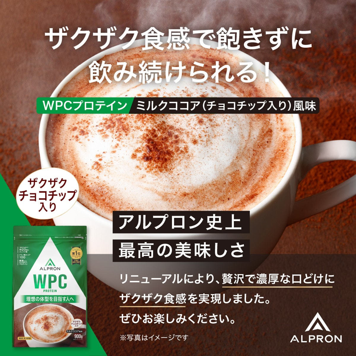 商品名:ALPRON WPC(ホエイプロテイン)ミルクココア風味(チョコチップ入り) 900g